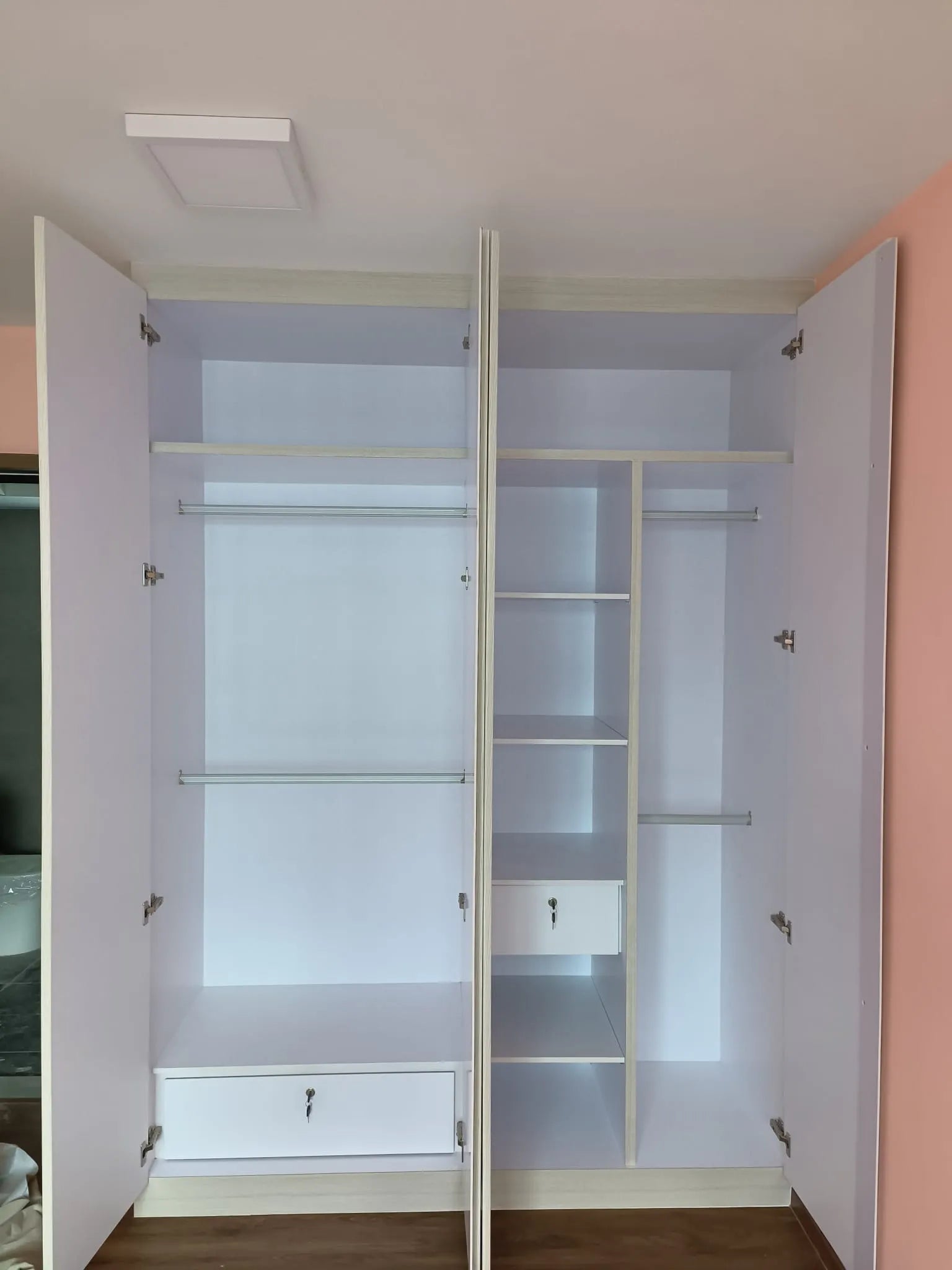 - Internal configuration: 3 drawers, 1 hanging bar, and 1 fixed shelf
